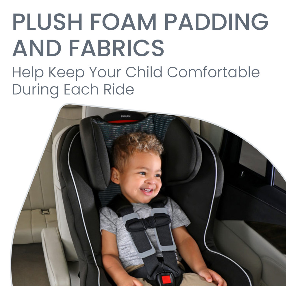 A cadeirinha de carro conversível Emblem ajuda a manter o bebêe confortável em todas as suas viagens Duas camadas de proteção contra impactos laterais envolvem a cabeça, pescoço e&