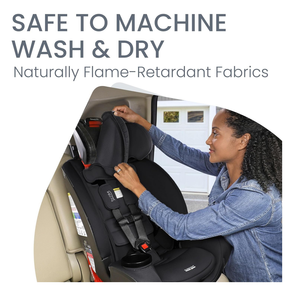A Britax One4Life vem com uma capa de fácil remoção e lavável à máquina, e a construção em tecido é naturalmente retardante de chamas.